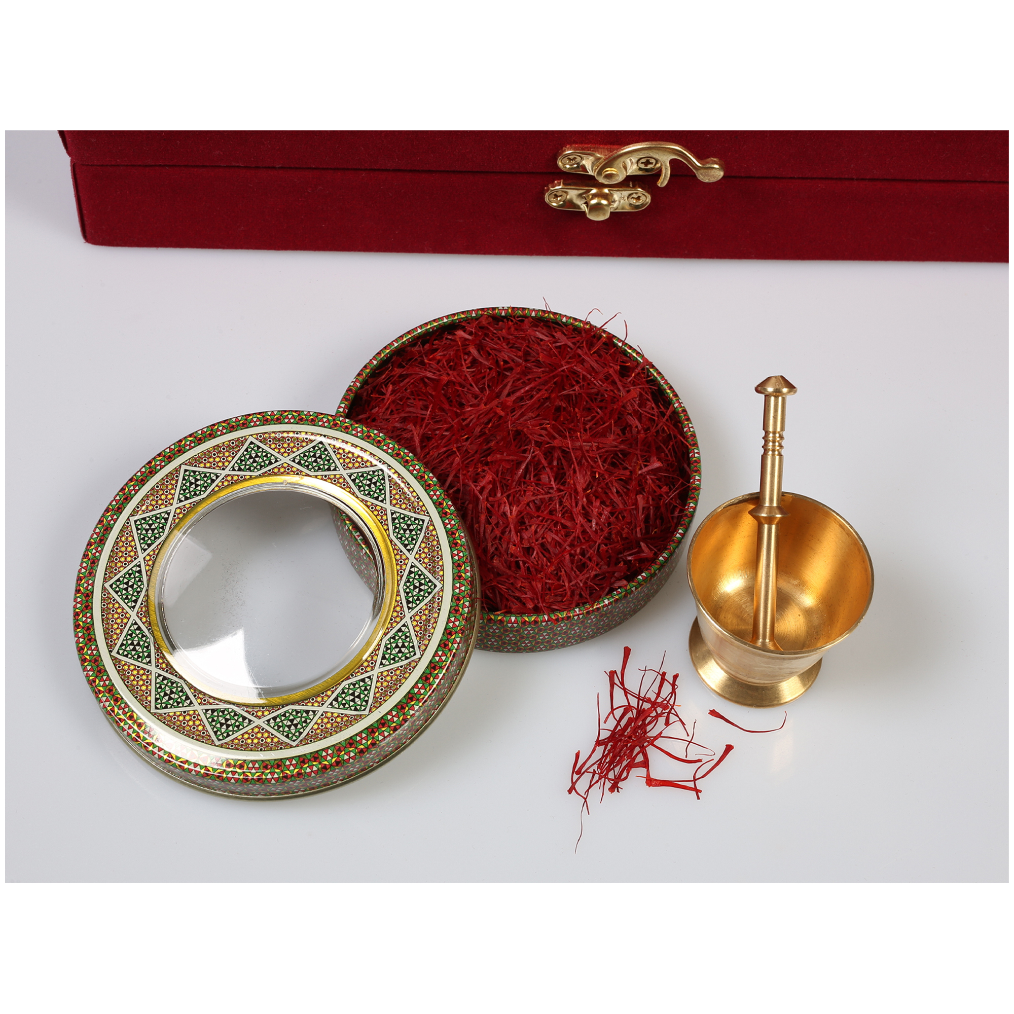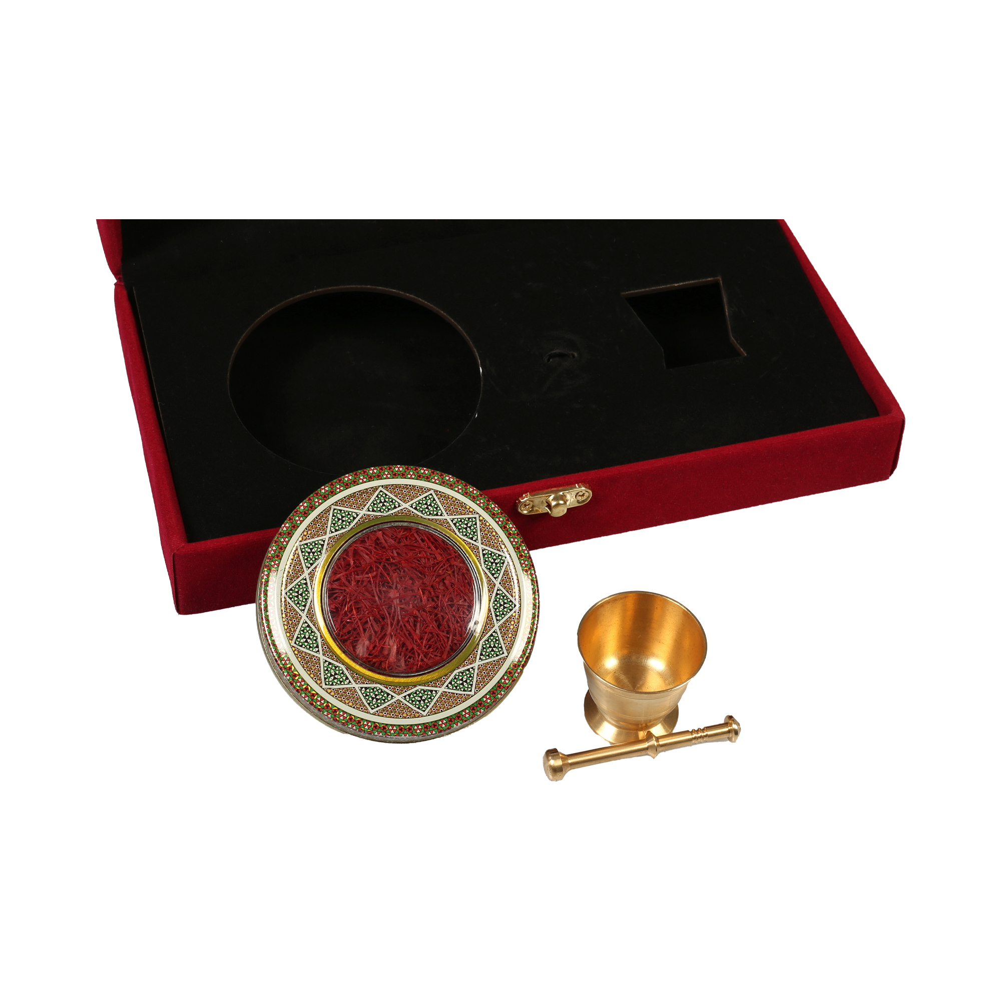 Safran Geschenkbox Metalldose in rotem Samt und Mörser
