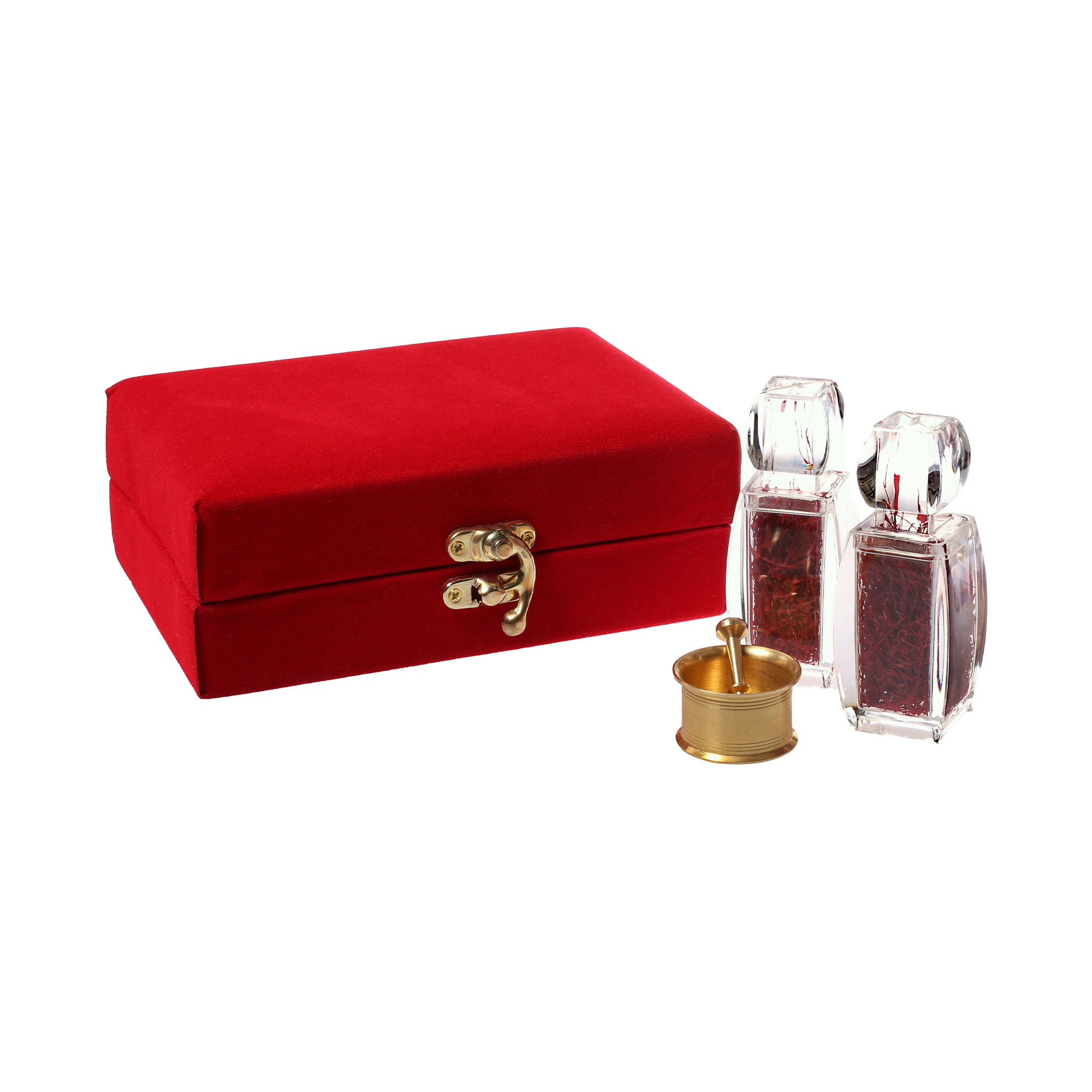 Safran Geschenkbox in rotem Samt mit zwei Aziandosen und großem Mörser